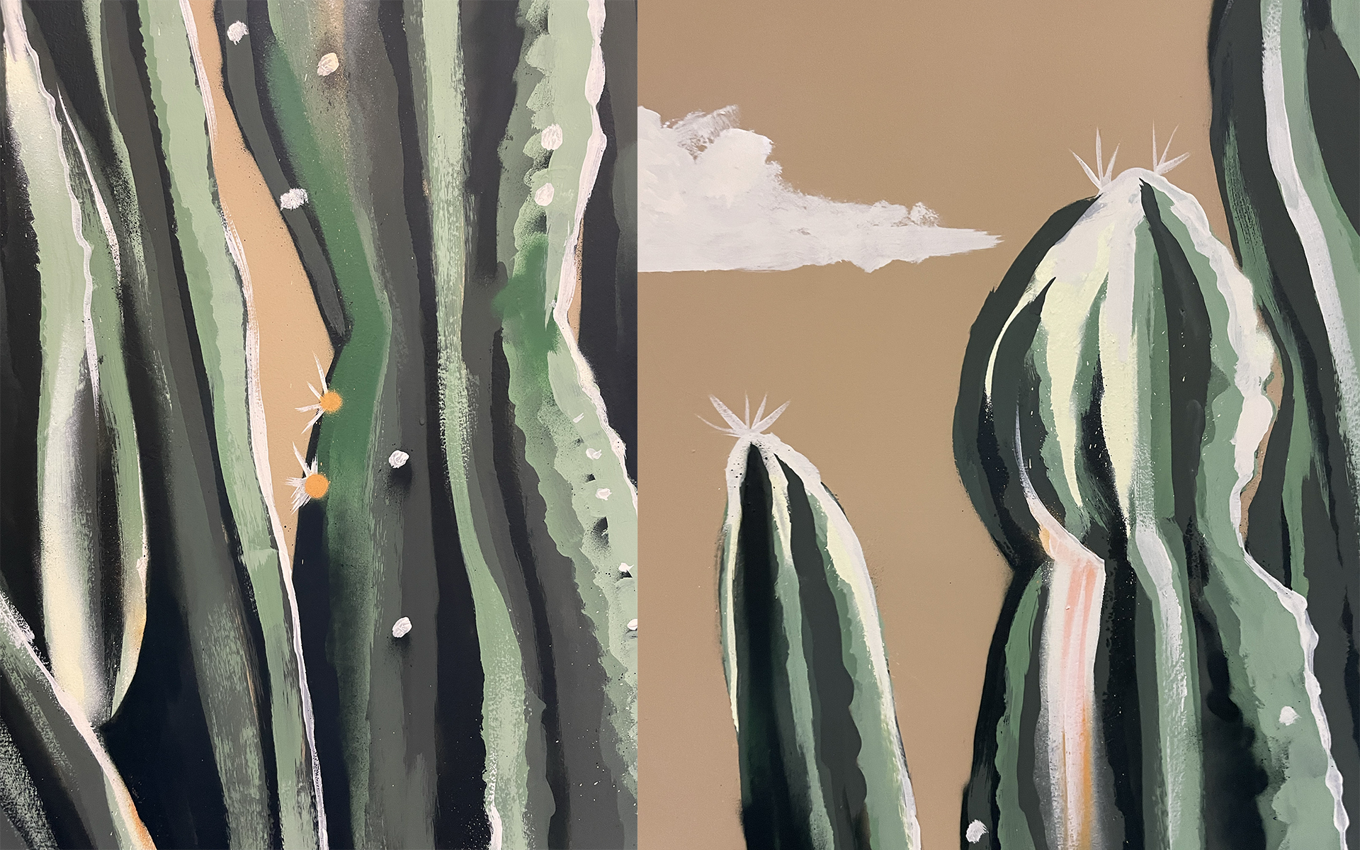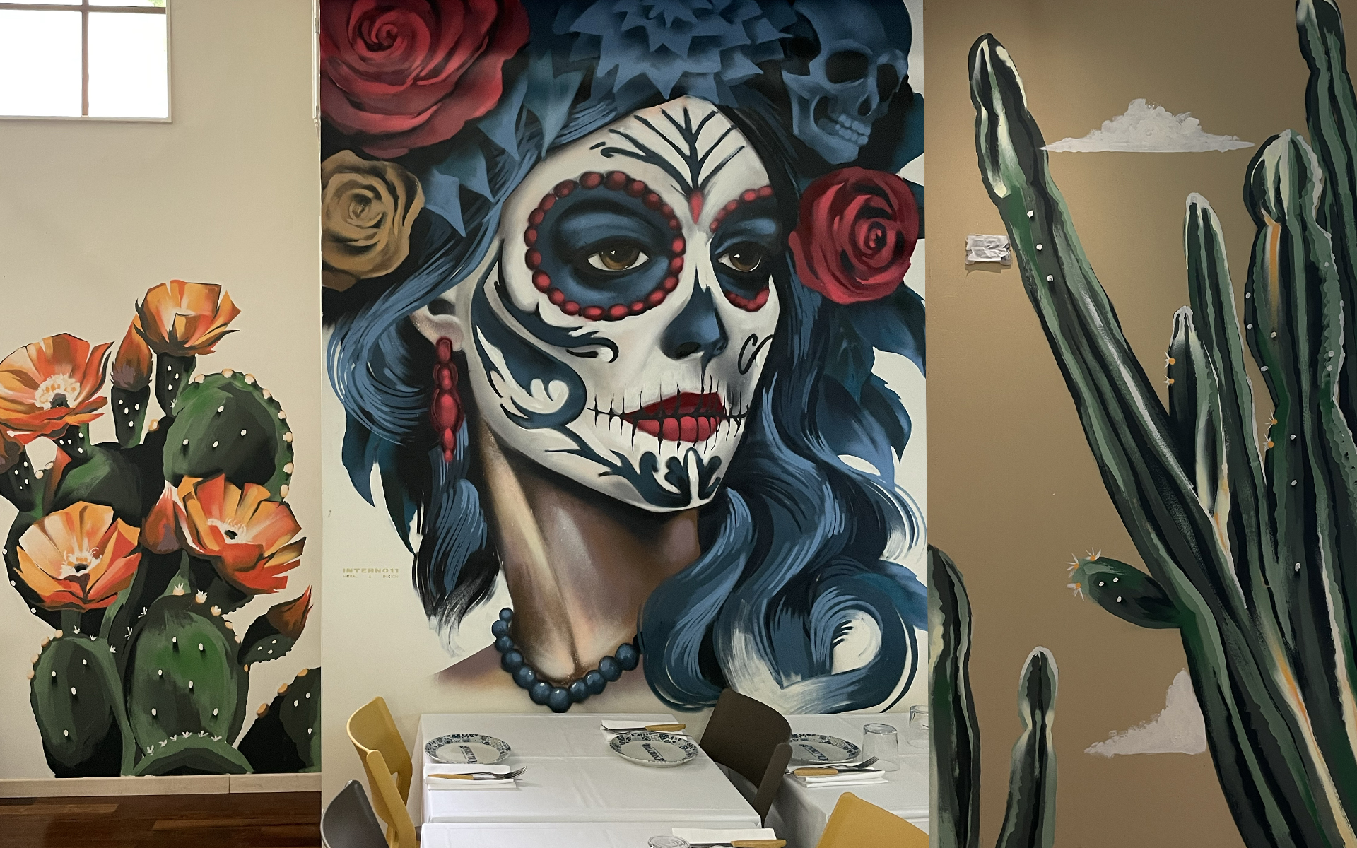 Nel locale Encuentro a Modena abbiamo creato un murales audace e coinvolgente, con riferimenti iconografici alla Santa Muerte e una vegetazione di cactus stilizzati che avvolge gli spazi: un mix audace tra folklore, grafica contemporanea e atmosfera esotica. Il progetto mira a sorprendere e a raccontare una storia, dando al locale un’identità visiva forte e unica. L’effetto finale è uno spazio mozzafiato, perfetto per chi cerca un’esperienza che va oltre il semplice locale.